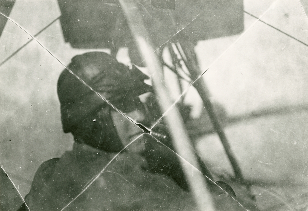 Flygaren John Hedenmarck i flygförarsitsen "i störtningsögonblicket". Bild tagen av flygspanare Åke Brilioth under flygning med flygplan Albatros NAB 9 nummer 960, den 13 juni 1918. Flygplanet havererade. Sprucken bild.