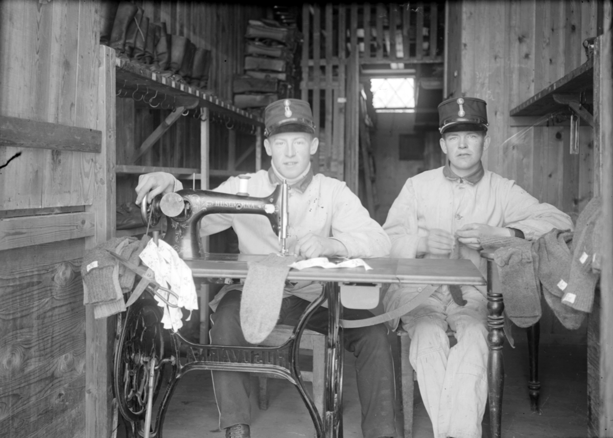 Två armésoldater från I 4 eller I 5 regemente i arbete vid en symaskin i ett förråd på Malmen. Mannen till vänster är Ernst Axfors