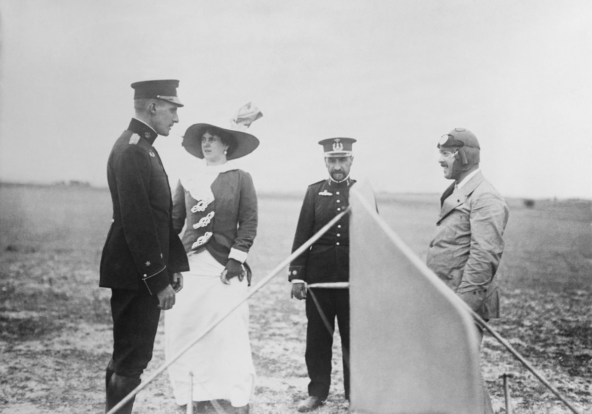 Flygaren Karl Illner i sällskap med två militärer och en kvinna på ett flygfält, tidigt 1910-tal i Österrike-Ungern. Del av flygplan i förgrunden. Reprofoto.