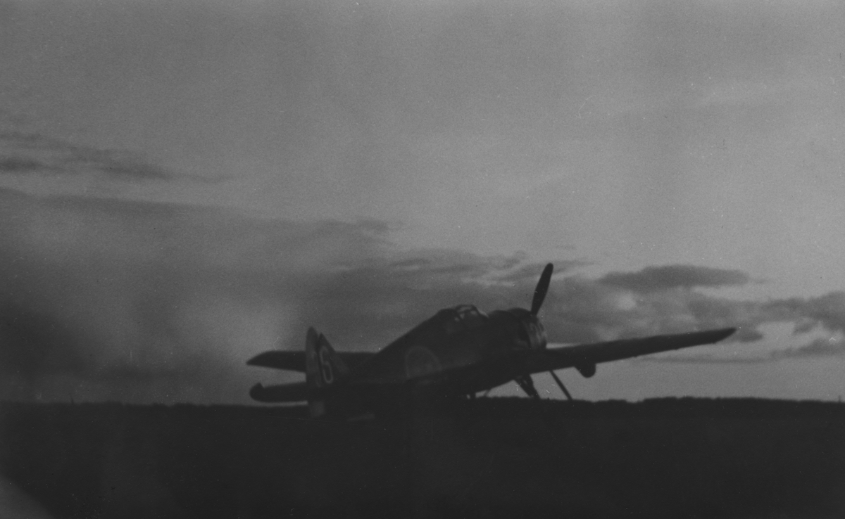 Flygplan J 22 märkt nr 36 står på ett flygfält, cirka 1943. Vy bakifrån, tagen i skymning.