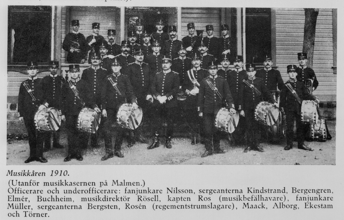 Musikkåren på livgrenadjärregementet på Malmen utanför musikkasernen ca 1910. Avfotografering av bild ur tryck.