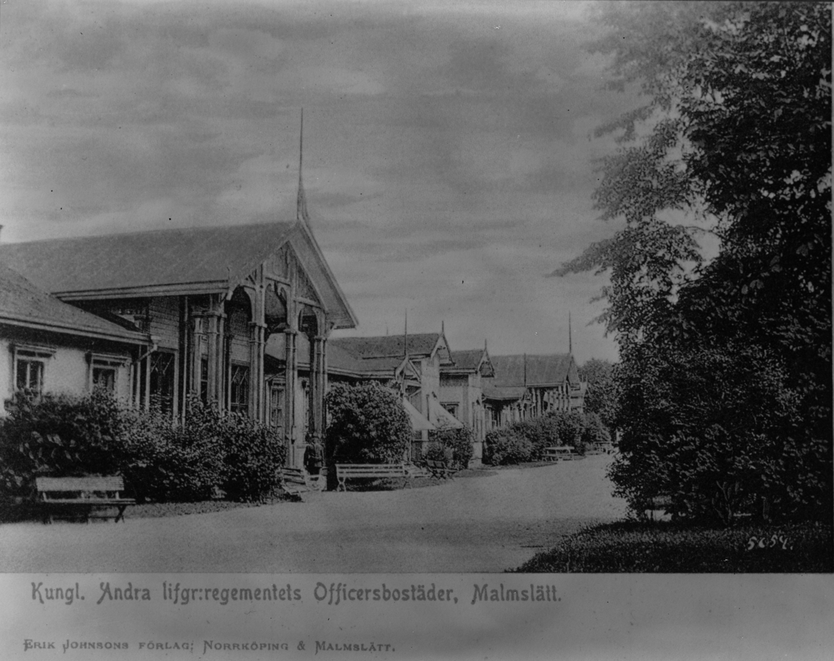 Exteriör av officersbostäderna på andra livgrenadjärregementet, Malmen. Avfotografering av brevkort.