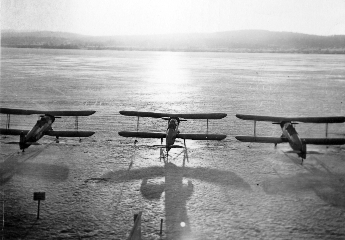 Översiktsbild av tre flygplan Sk 12 ståendes på en sjö, vintertid. Vy bakifrån, med motljus och berg i bakgrunden. Cirka 1936-1939.