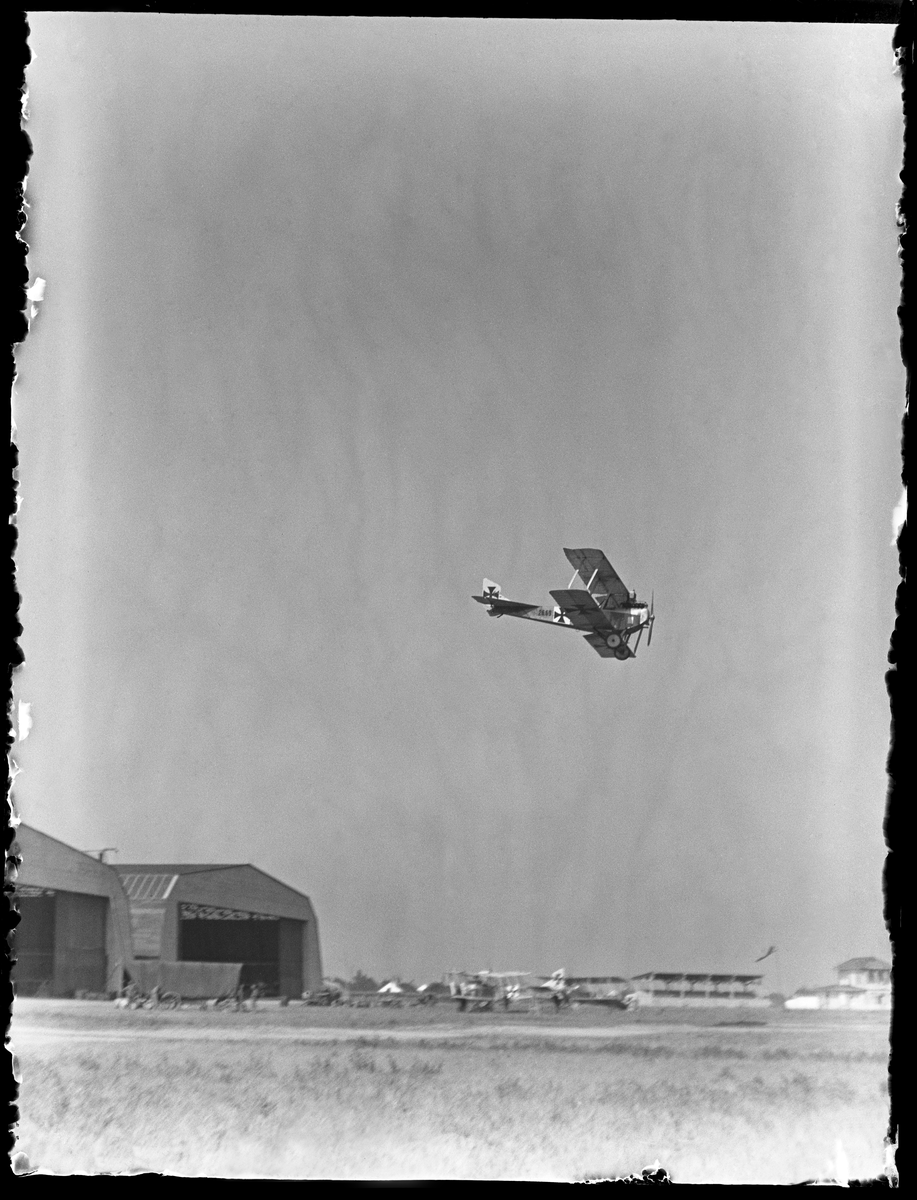 Militärt flygplan Hansa Brandenburg C.I märkt 26.69 tillhörande Österrike-Ungern flyger lågt över flygfält. Byggnader och flygplan i bakgrunden.