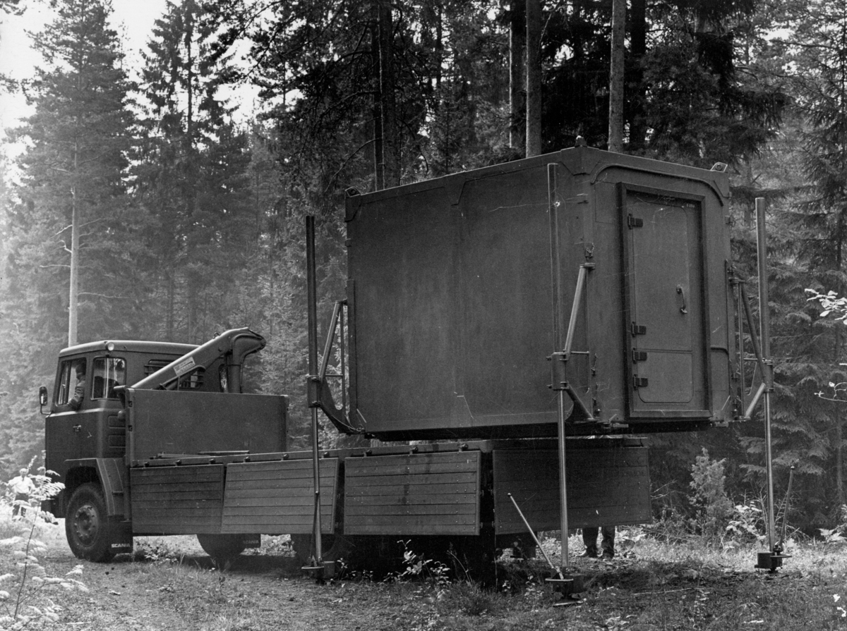 TMR-13 - Transportabel markradio. Försvarets Materielverk utför försök med plasthydda till TMR -13. Försök med hydraulisk lyftanordning. Hyddan lyftes upp på robotvagn.
