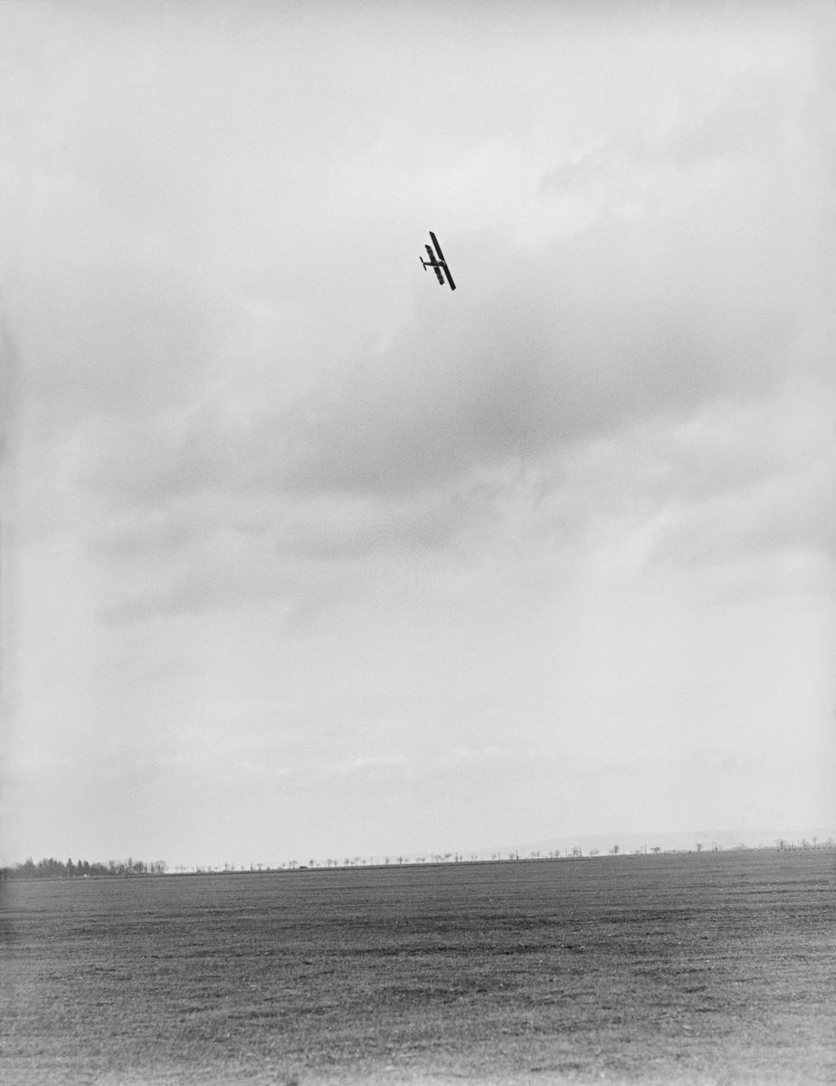 Militärt flygplan Fokker B.I tillhörande Österrike-Ungern i luften över flygfält. Vy framifrån.