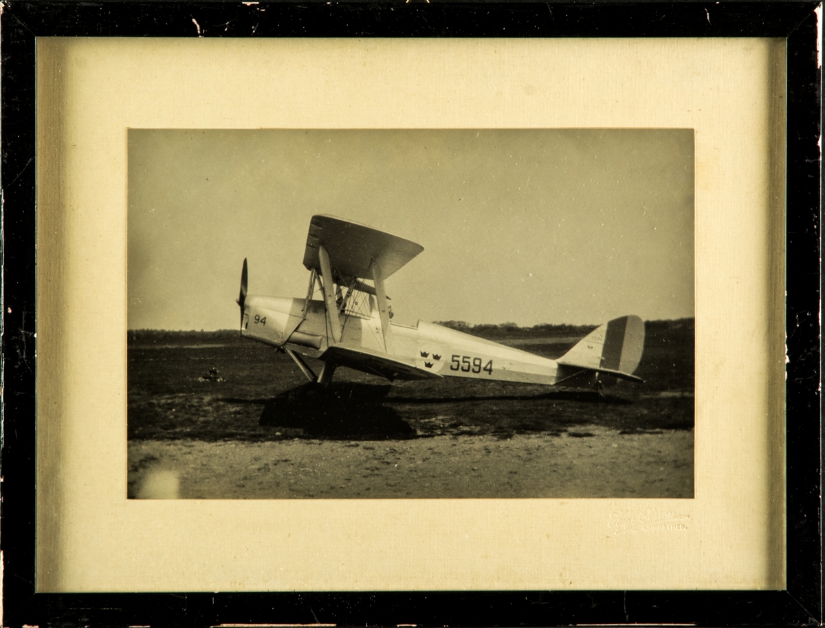 Skolflygplan SK 11 nummer 5594 tillhörande F 5 Krigsflygskolan står på flygfält. Inramat foto.