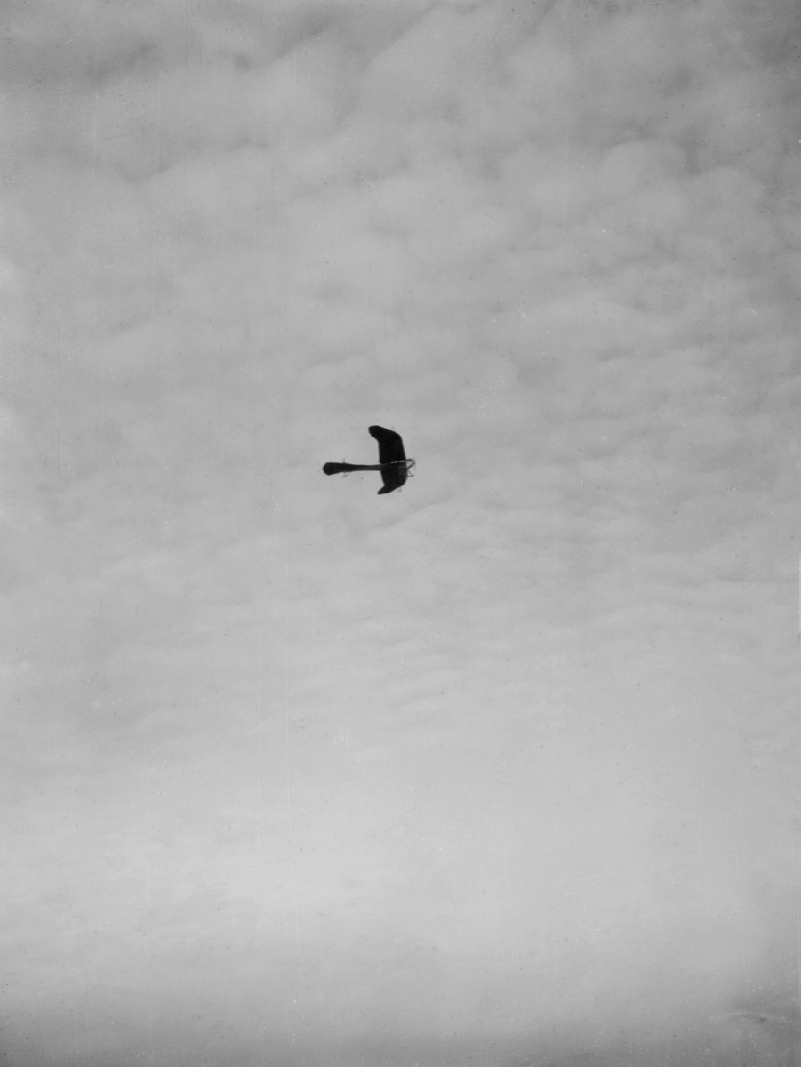 Flygplan Etrich Taube i luften över flygfält i Österrike-Ungern. Vy från sidan.