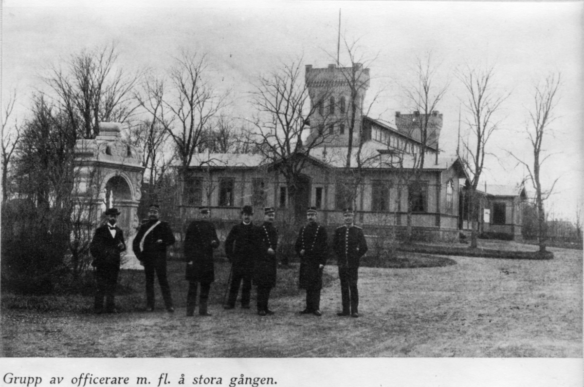 En grupp av officerare och andra män poserar framför officerssalongen på Malmen. Avfotografering av bild ur tryck.