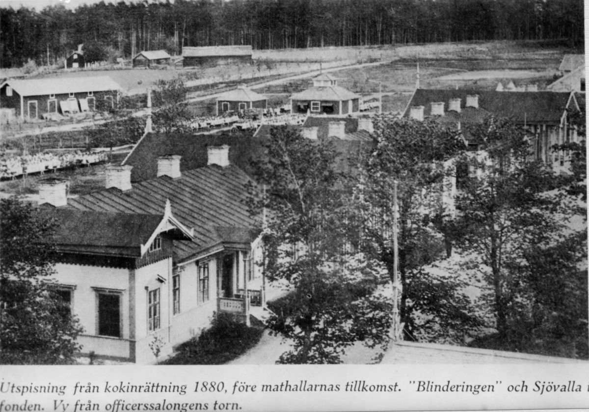 Byggnader vid livgrenadjärregementet på Malmen. I bakgrunden syns kokinrättning för utspisning av manskap. Avfotografering av bild ur tryck.