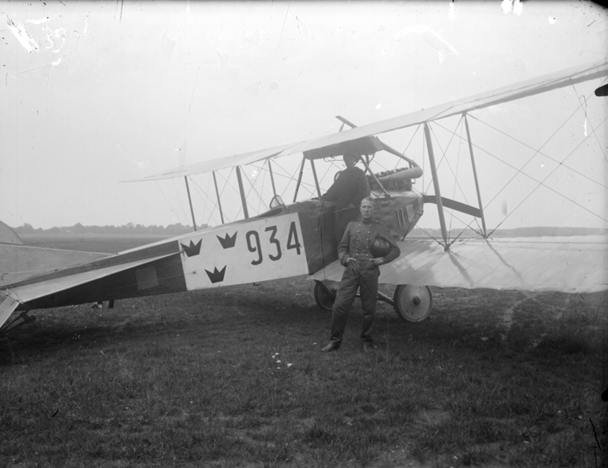 Löjtnant poserar framför flygplan Albatros SW märkt 934 på Malmen. I förarsits står en tekniker.