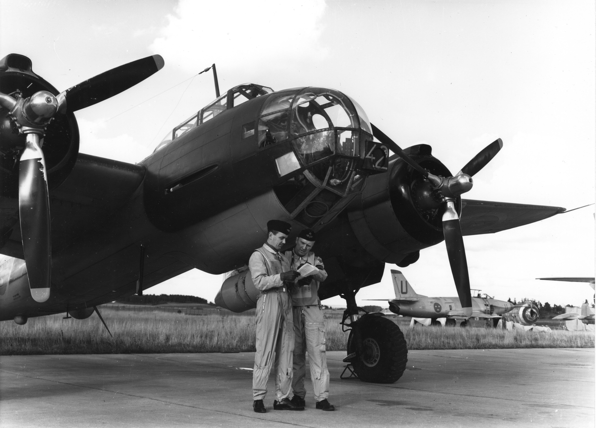 Två militära flygare läser från ett papper framför flygplan S 18 på flygbana vid Försökscentralen, FC, i Linköping. I bakgrunden syns provflygplan för Saab 32 Lansen. Vid hämtning av flygplanet tillbaka till F 11, Södermanlands flygflottij efter modifiering.