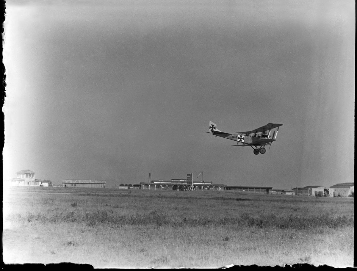 Militärt flygplan Hansa Brandenburg C.I märkt 26.69 tillhörande Österrike-Ungern på låg höjd över flygfält. Byggnader i bakgrunden.