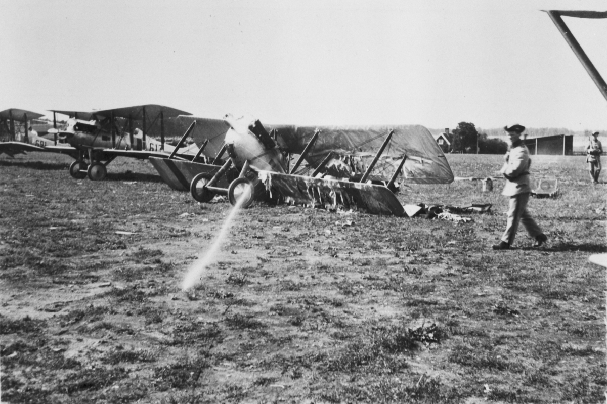 Flygplan J 2 nummer 67 står på Flygkompaniets flygfält på Malmen efter explosion vid luftpåfyllning den 15 augusti 1926. Två militärer bredvid flygplanet. I bakgrunden syns flyplan J 2 nummer 617 och 621.