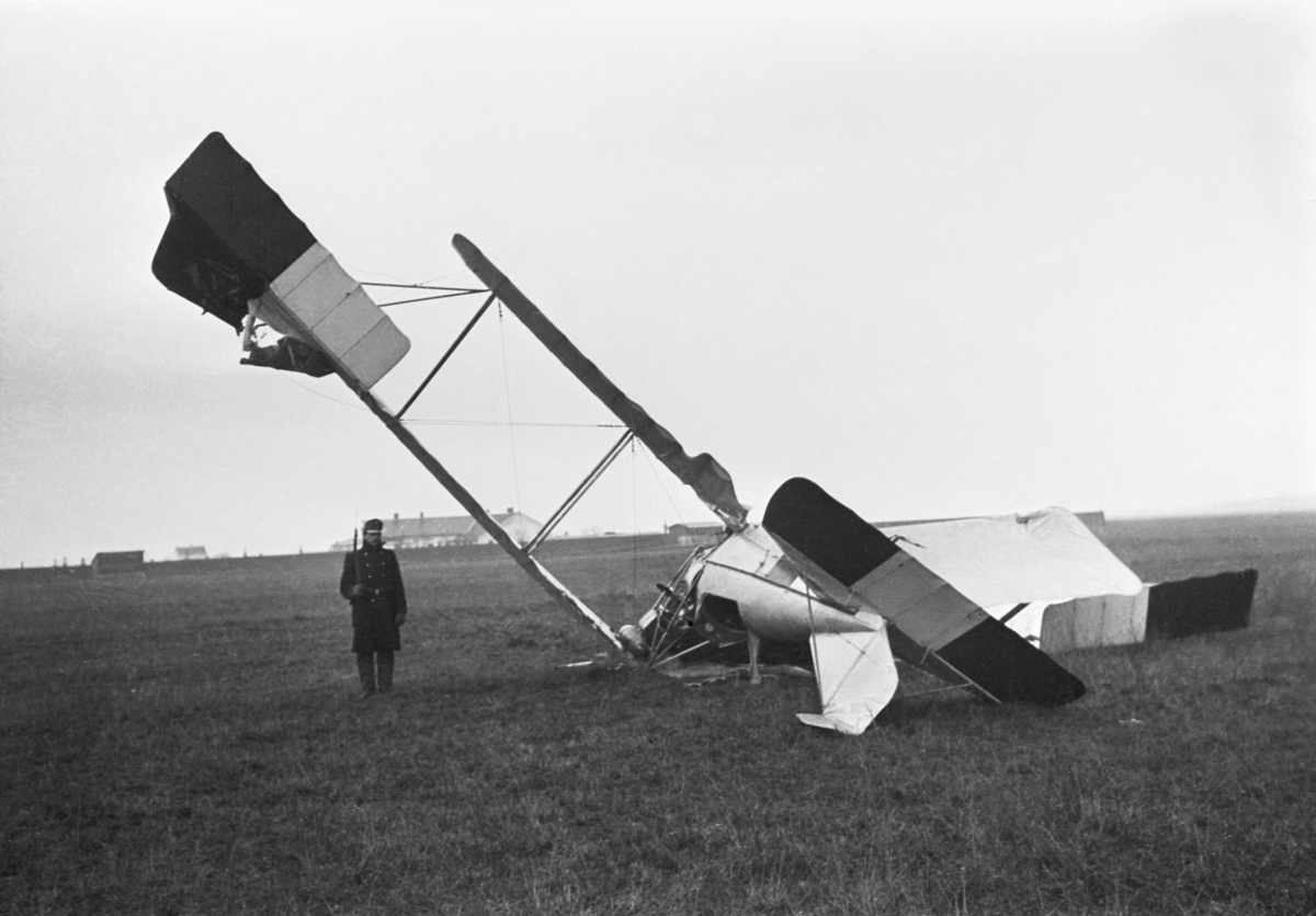 Havererat militärt flygplan Lohner B.VII tillhörande Österrike-Ungern ligger på ett flygfält. En militär står vakt vid flygplanet. Byggnader i bakgrunden. Vy bakifrån.