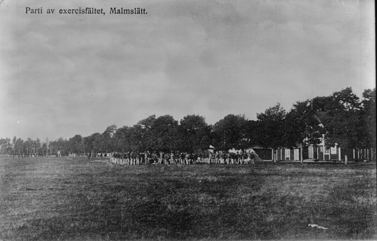 Exercisfält vid livgrenadjärregementet på Malmen. Soldater uppställda på fältet. Avfotografering av vykort.