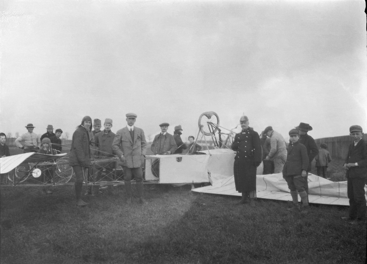 Folksamling kring havererat flygplan Bleriot XI på ett fält under första världskriget i Österrike-Ungern. Vy bakifrån.