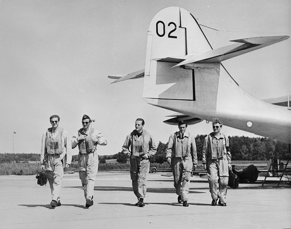 Besättningen på flygplan TP 47 Catalina. Fem besättningsmän i flygarutrustning framför flygplansstjärten på TP 47 002.
