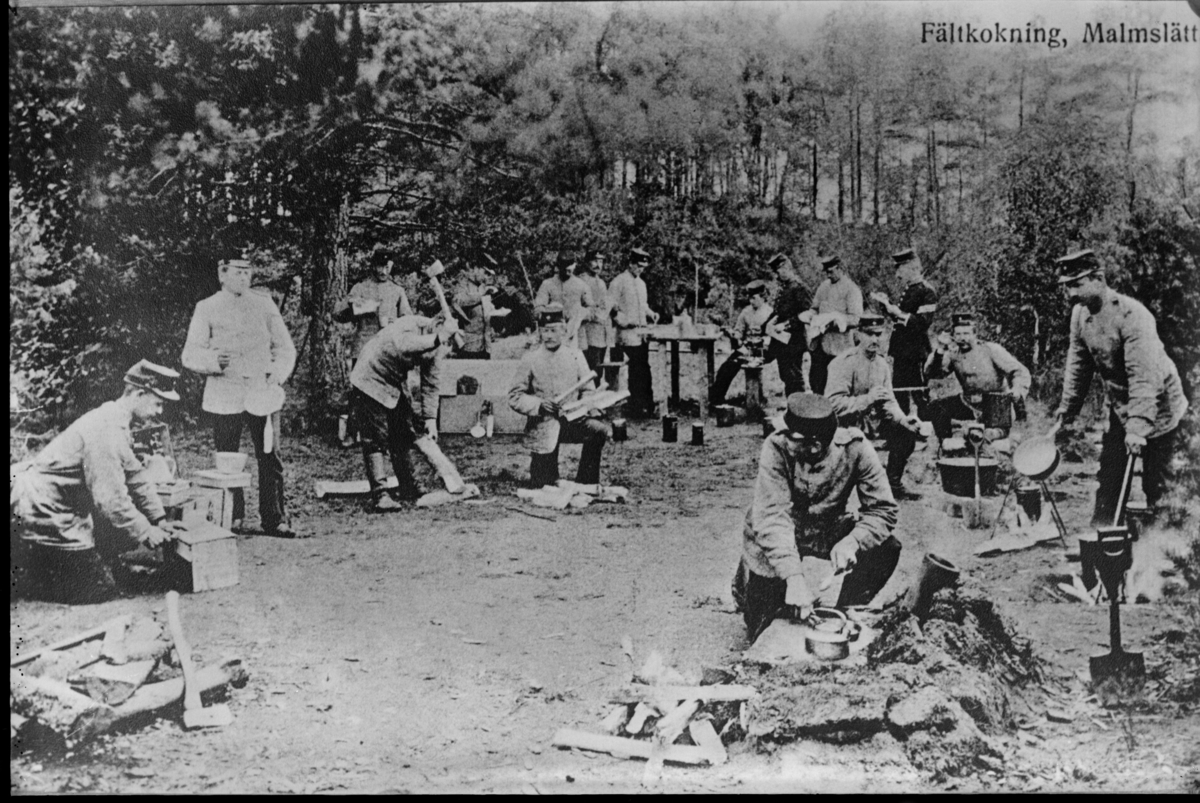 Matlagning i fält för soldater vid 7 kompaniet första livgrenadjärregementet I 4. Avfotografering av vykort.