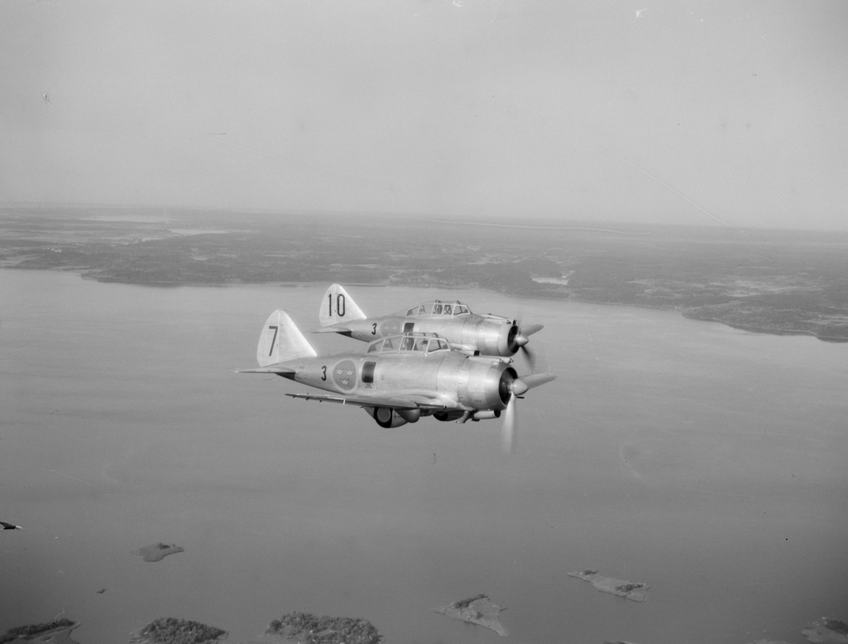 Två flygplan J 9 S från F 3 Malmen flyger i rote över sjön Roxen.