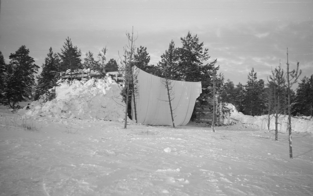 Ett flygplanvärn för flygplan Hawker Hart vid F 19, Svenska frivilligkåren i Finland. Ett tygskynke hänger framför värnet.