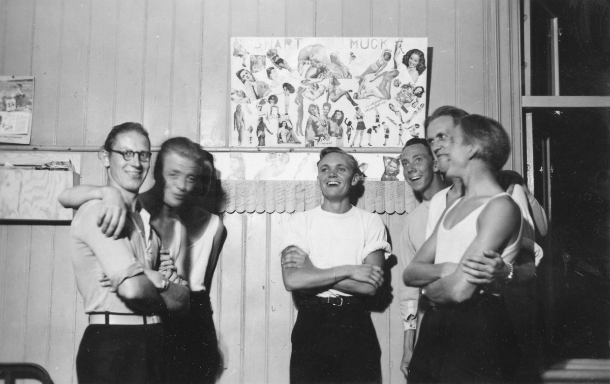Grupporträtt. Sex värnpliktiga män står vid en 'muckarkam' på ett logemente på F 6 Västgöta flygflottilj, 1940-tal.
