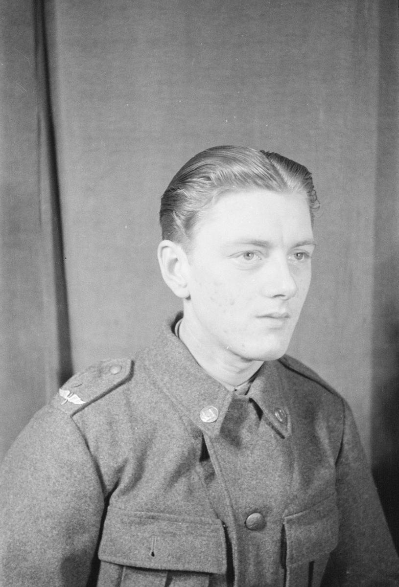 Porträttfoto av soldat Gunnar Bertil Gustaf Rundgren (nummer 837), skrivbiträde vid F 19, Svenska frivilligkåren i Finland under finska vinterkriget, 1940.
