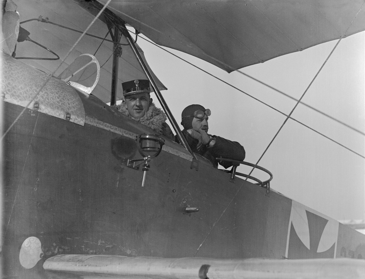 Flygförare och flygspanare i militärt flygplan Hansa Brandenburg C.I tillhörande Österrike-Ungern. Vy snett framifrån.