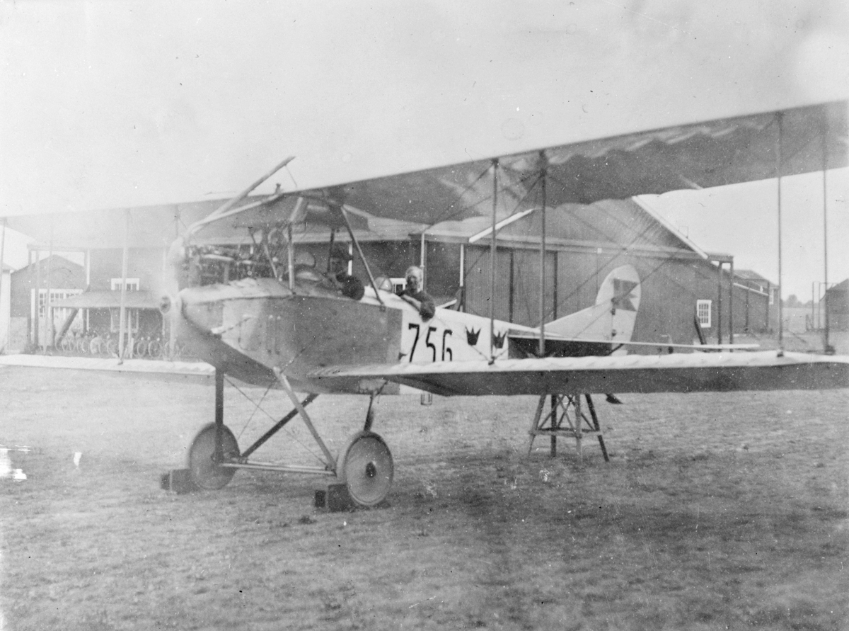 Flygplan Albatros NAB 9 nummer 756 tillhörande Flygkompaniet står uppställd på bock på flygverkstäderna Malmslätt. Två flygmekaniker sitter i flygplanet.