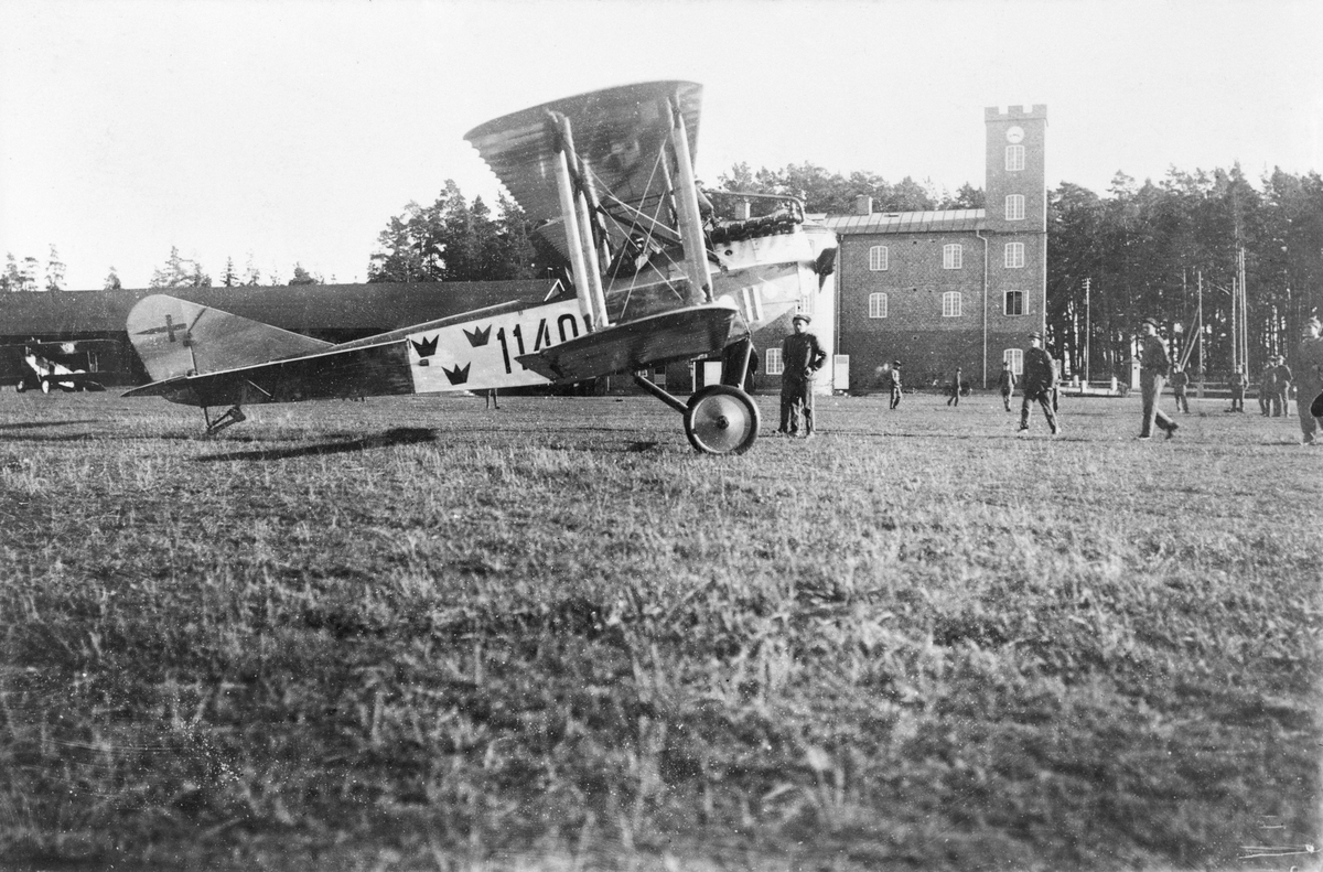 Titel: Flygplan FVM Albatros 160 märkt nr 1140 uppställt på flygfältet framför kanslihuset på Flygkompaniet på Malmen, ca 1921-1922.