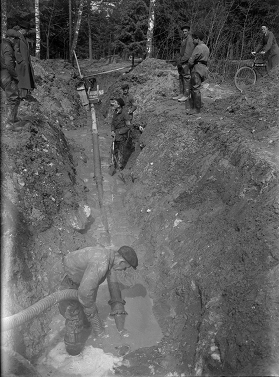 Vattenledningsrör som sprängts under luftskyddsövning på F 2 Roslagens flygflottilj. Personer längs dike i arbete.