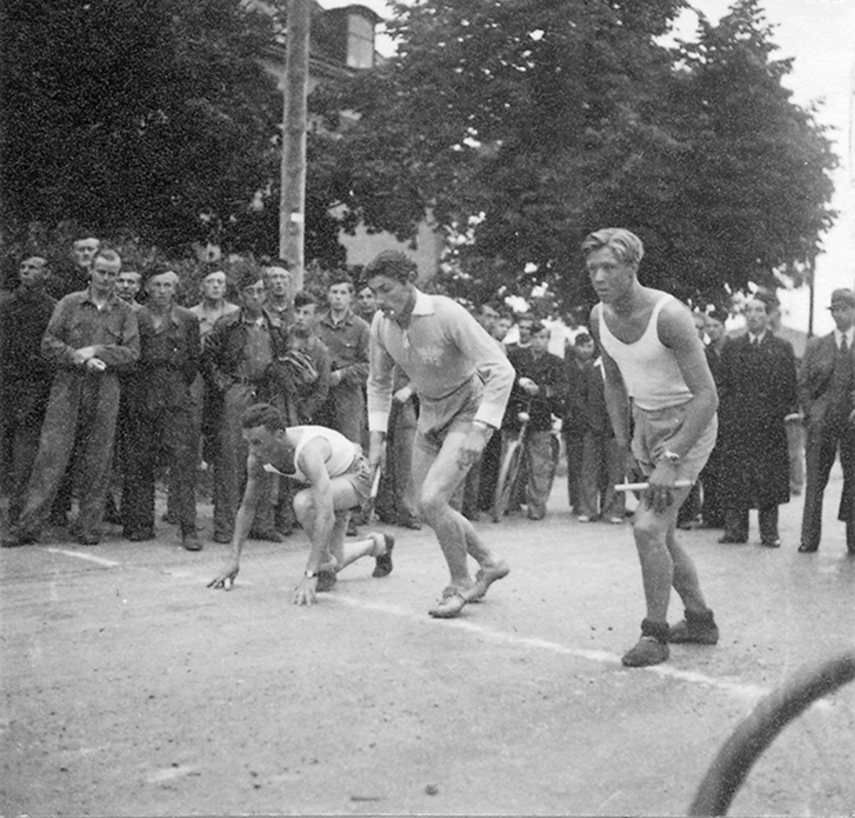 Stafettlöpare på startlinjen vid idrottstävling mellan F 2 Roslagens flygflottilj och F 3 Östgöta flygflottilj på Fårösund, 1942.