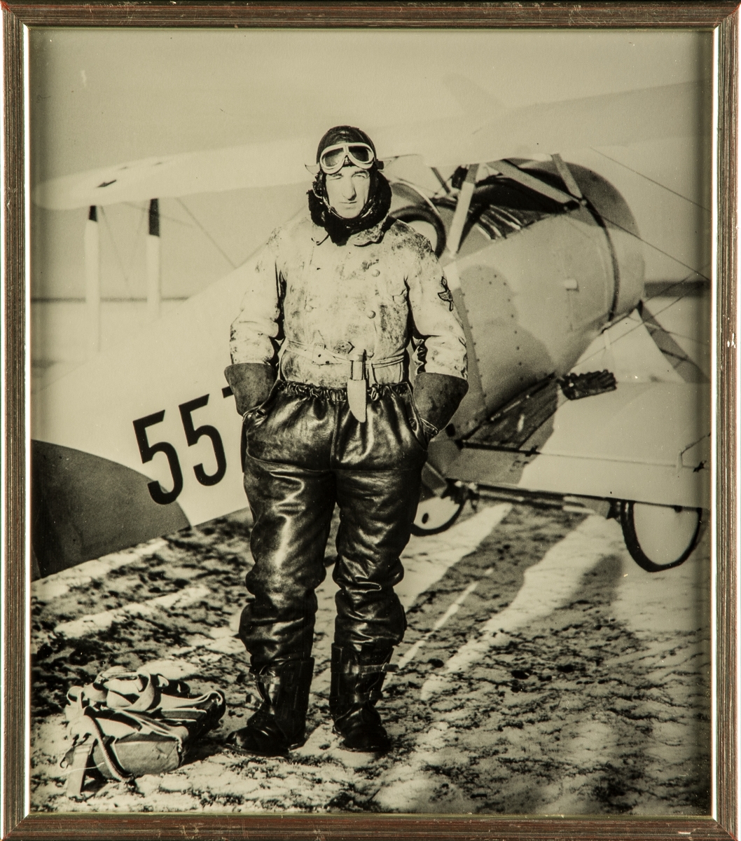 Porträtt. F 5:s förste chef kapten Arvid Flory i flygdräkt framför flygplan Ö 1 Tummelisa 1930. Inramat foto.