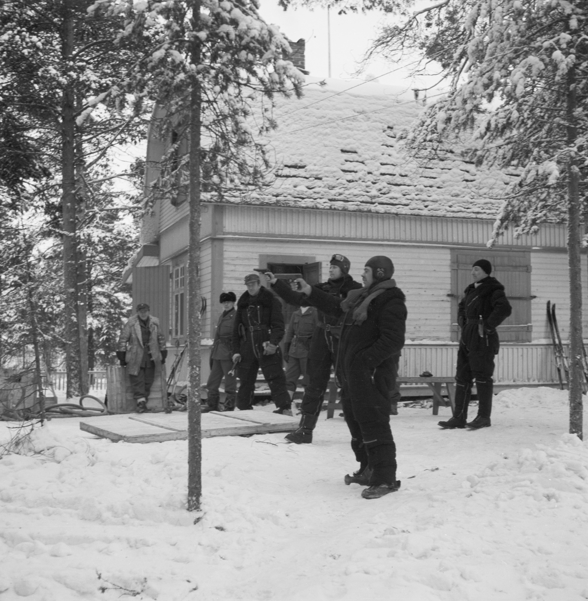 Skjutövning med pistol vid Svenska frivilligkåren i Finland, F 19. Flygförare övar pistolskytte. På bilden syns Åke Söderberg (i keps i mitten), Arne Frykholm (i flygluva och flygglasögon) samt längst till höger Ian Iacobi.