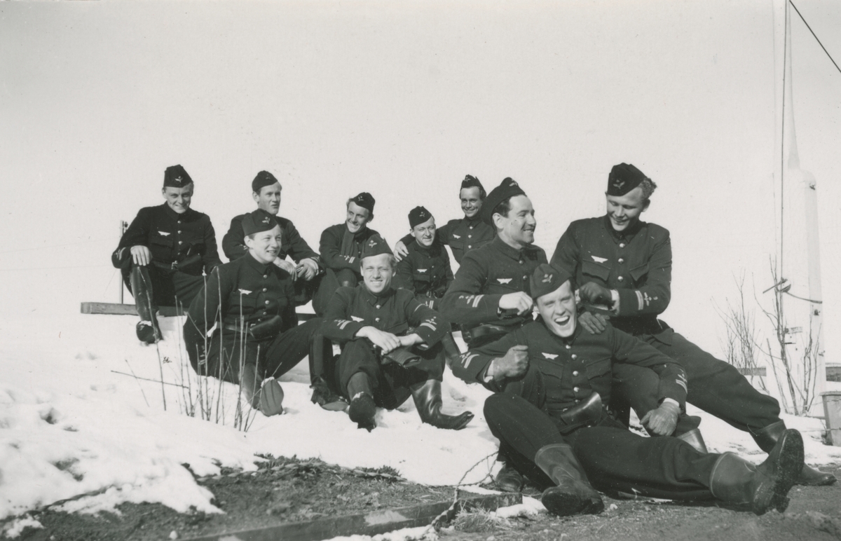 Tio flygsoldater sitter på marken under rast i Kiruna, vintertid, april 1942.