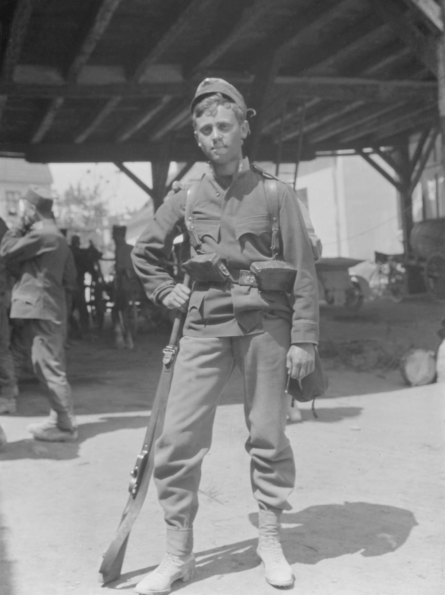 Porträttfoto av soldat från Österrike-Ungern under första världskriget. I uniform med gevär.
