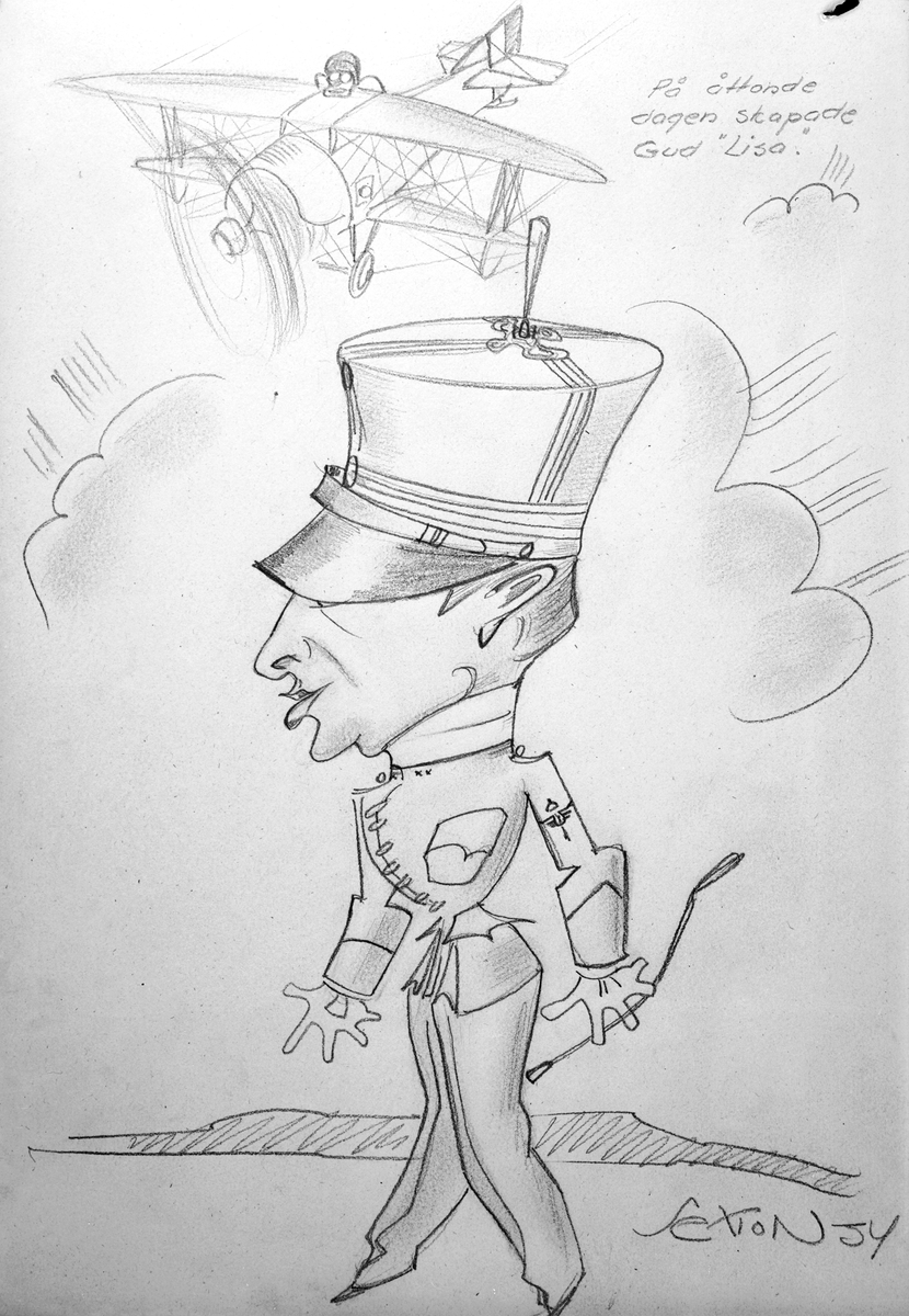 Karikatyrbild av löjtnant Schönbeck ur flygvapnet vid F 3 Malmen. Avfotograferad teckning.