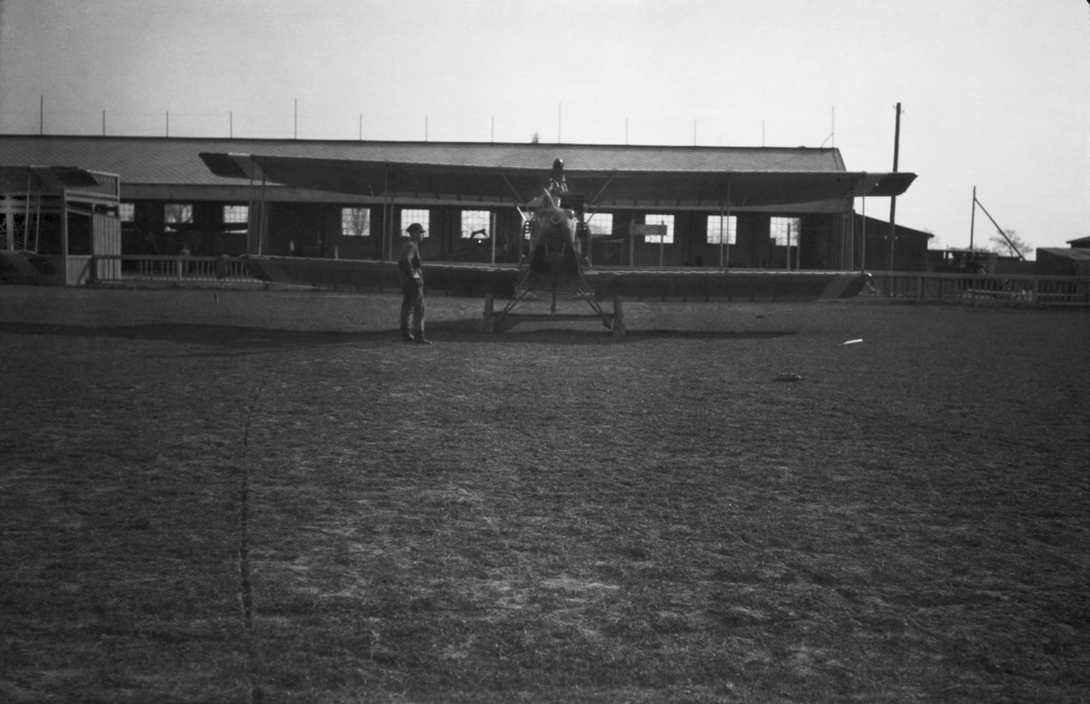 Militärt flygplan Albatros tillhörande Österrike-Ungern står uppställt framför flyghangar. En mekaniker står bredvid. Vy framifrån.