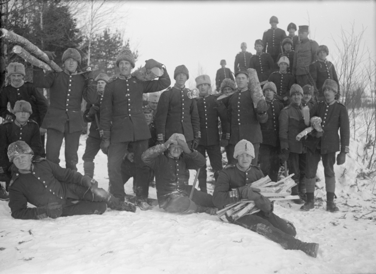 Grupporträtt. En större samling armésoldater från I 4 och / eller I 5 regemente samlar ved, vintertid.