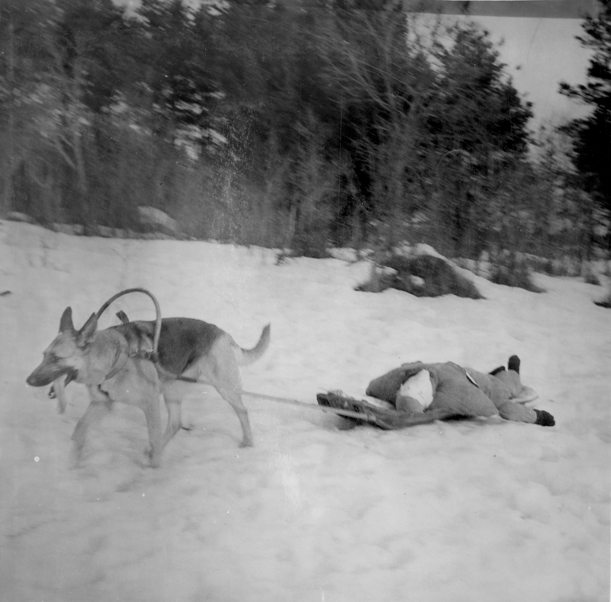 Militärhund drar en släde med en docka vid sjukvårdsövning i fält vid F 11 Södermanlands flygflottilj, 1945. Hundens namn är Cleo.