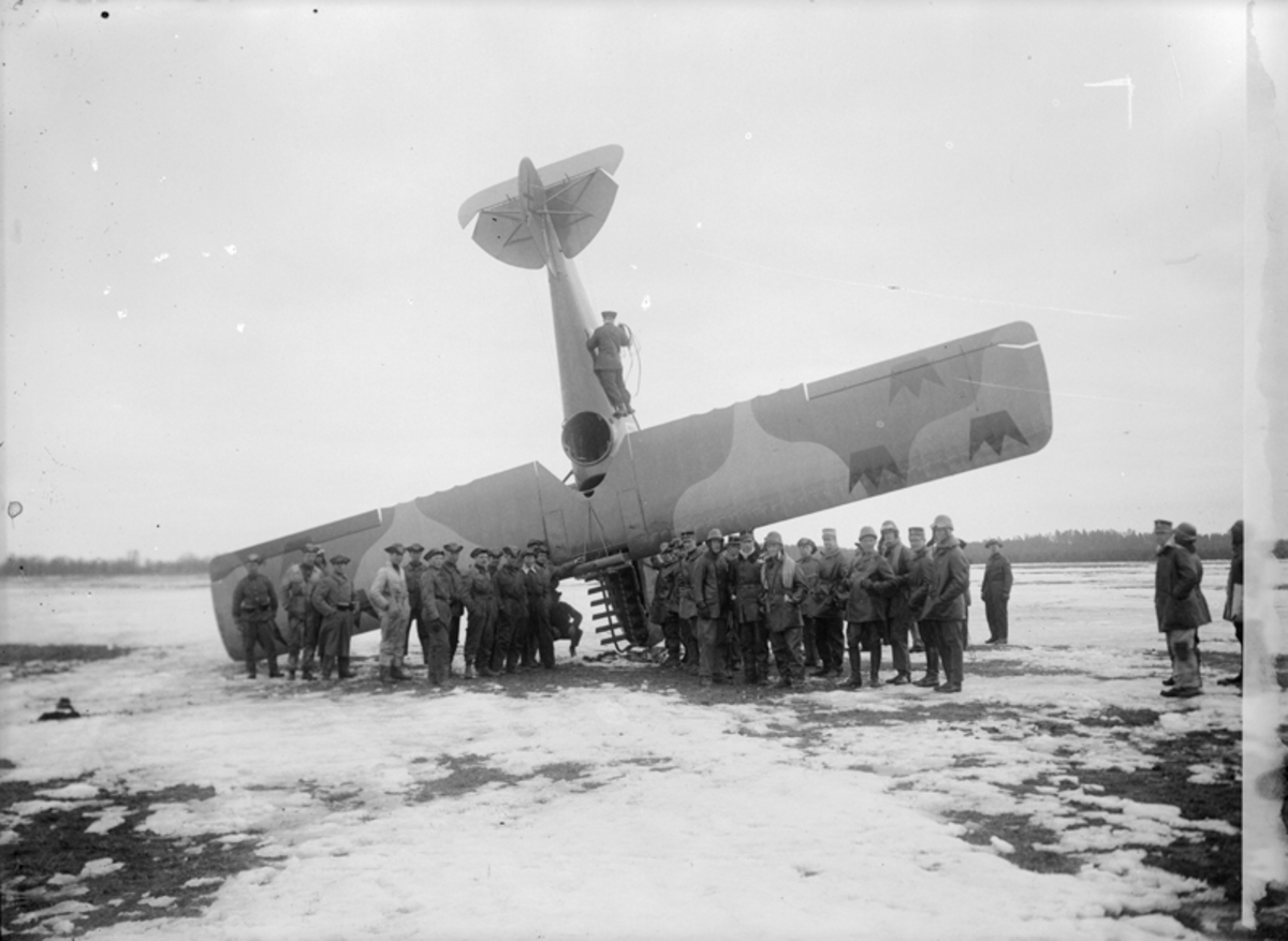 Haveri. Ett flygplan FVM S 18 har ställt sig på nosen på Malmen. Folksamling poserar framför flygplanet.
