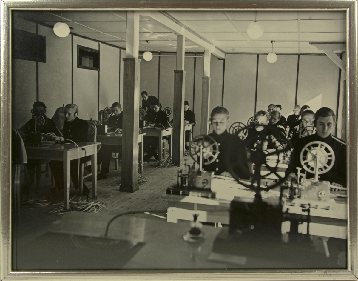 Signaltjänst och telegrafering på F 5 i Ljungbyhed. Värnpliktiga elever övar telegrafering, 1937. Inramat foto.
