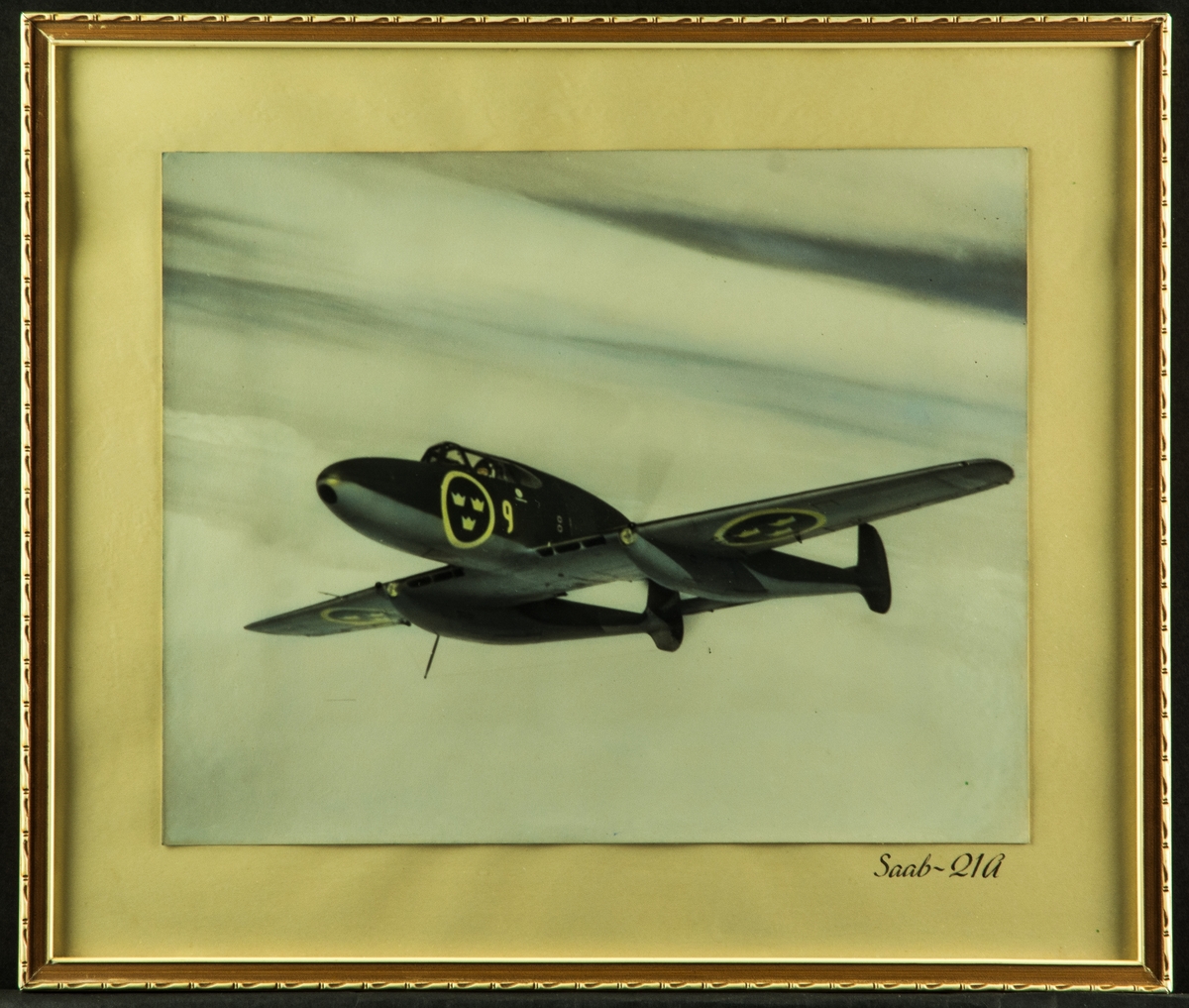 Flygplan J 21A tillhörande F 9 Göta flygflottilj under flygning. Kolorerat foto. Inramat foto.