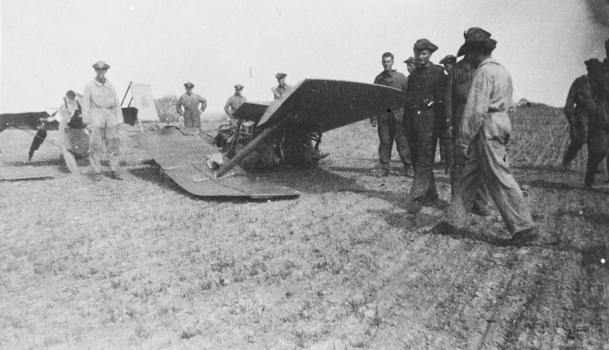 Havererat flygplan J 1, Phönix D. II nr 973 ligger på ett fält, 1925. Militärer kring flygplanet.