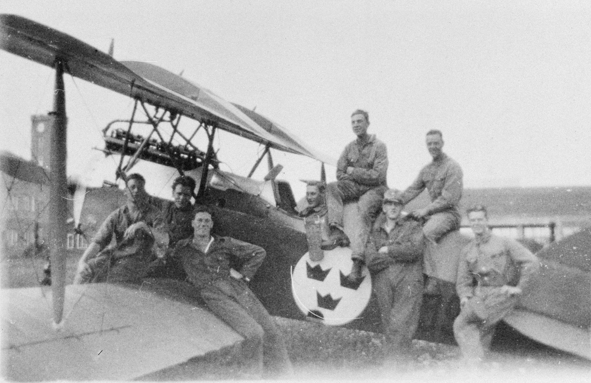 Åtta militärer sitter på ett flygplan J 1 Phönix DII på flygfältet vid Centrala flygverkstäderna Malmen, cirka 1926-1932. Kanslihus i bakgrunden.