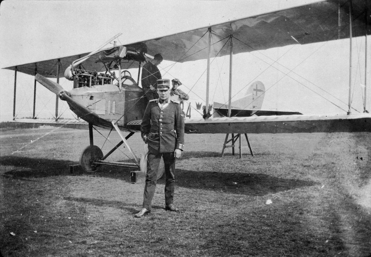 Flygplan NAB 9, Albatros nr 854 står uppställd på bock på ett flygfält. En flygspanare står framför flygplanet och två flygmekaniker sitter i flygplanet. Omkring 1919-1925.