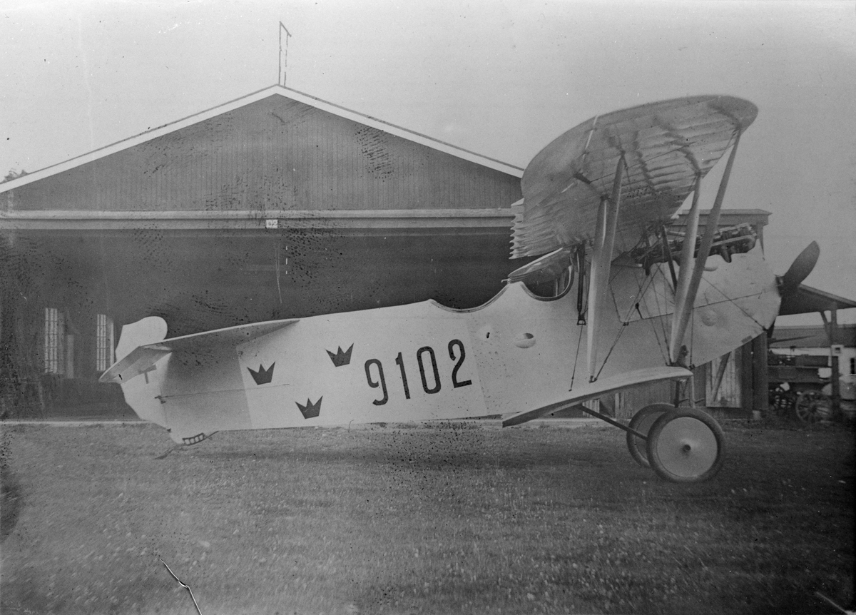 Flygplan Phönix Dront C.I nr 9102 tillhörande Flygkompaniet står framför hangar på Malmen, omkring 1919. Ur-Dronten, det första flygplan Dront i Flygkompaniet.