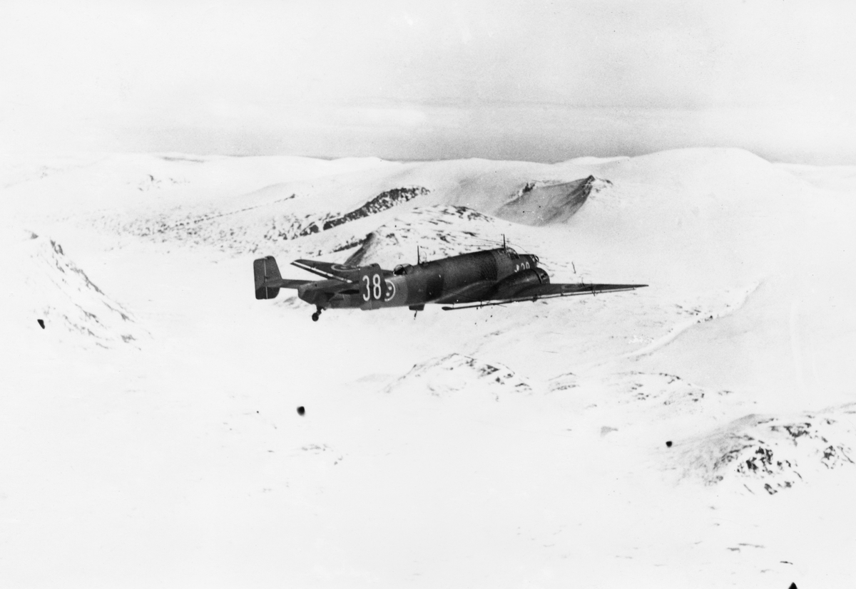 Flygfotografi av flygplan B 3, märkt 38 från F 1 över fjäll, vintertid. Under övning omkring 1945-1946.