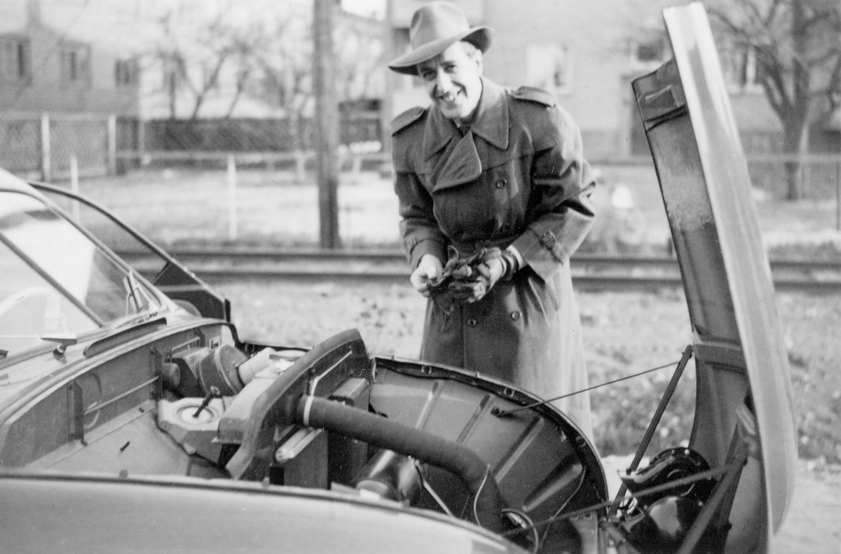 En man står vid en bil modell Saab 92 som har motorhuven öppen.