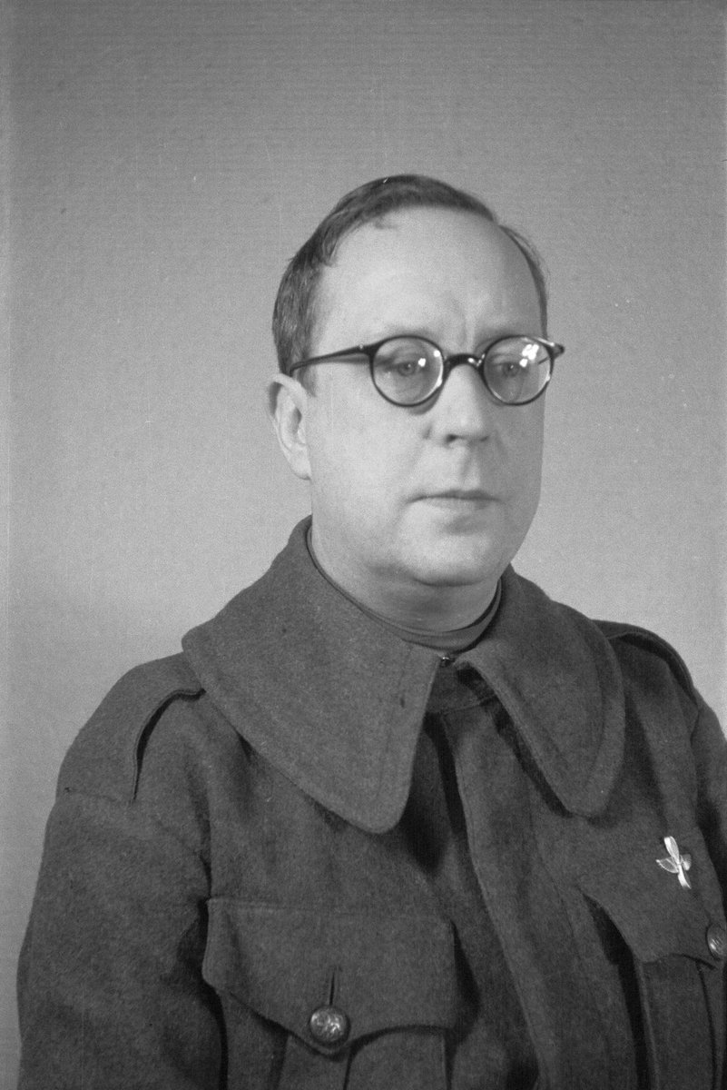 Porträttfoto av fänrik Gustav Sundén (nummer 990), tolk vid F 19, Svenska frivilligkåren i Finland under finska vinterkriget, 1940.